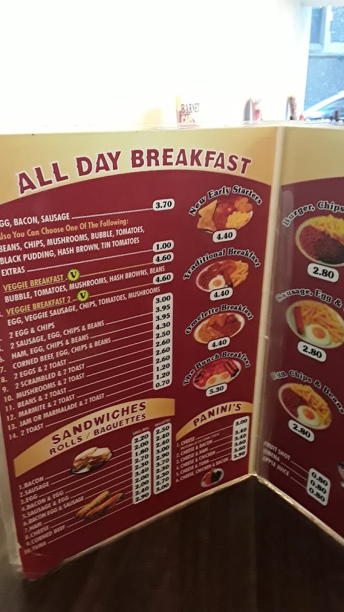“ This is a Family Owned Cafe based in the centre of Barnet Church, such a lovely atmosphere and delicious options! I usually always go for a chicken burger with tomato slice inside and with chips and Diet Coke. However this restaurant is a 20/10 it is just too nice to explain with words. I’ve been going to this cafe for over 10 years and they are always amazing and smiling whilst serving food. Allergies are taken seriously as well. Toilets available as well. ”